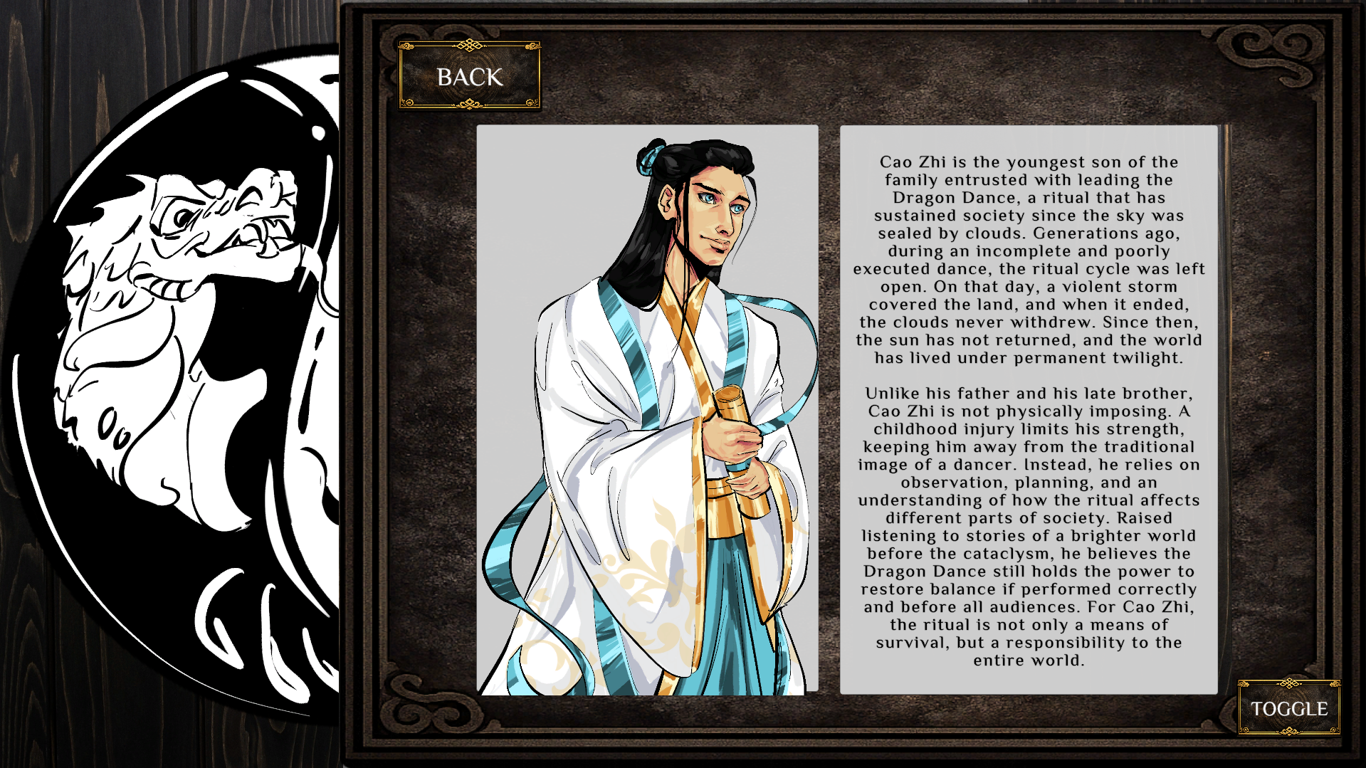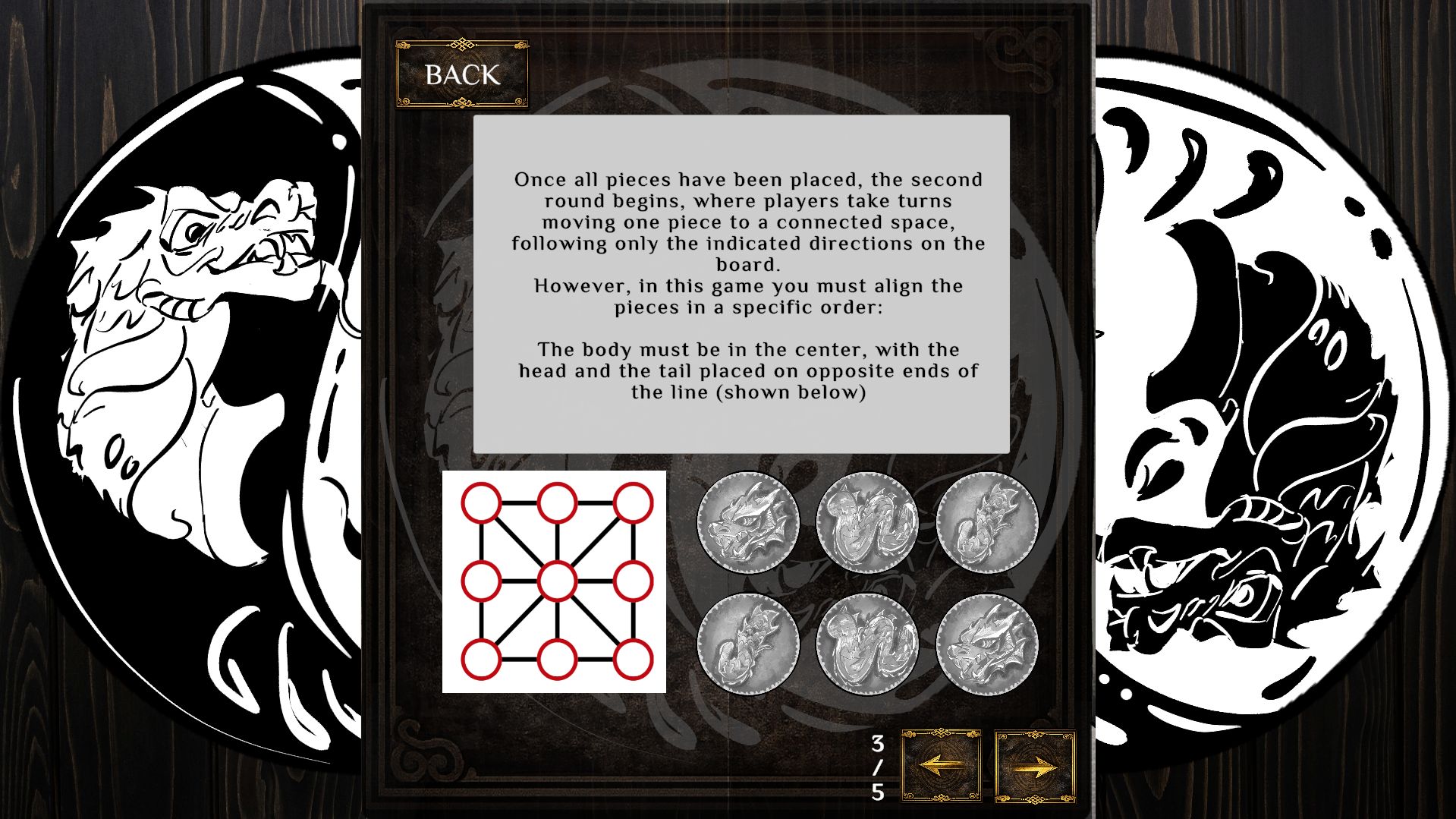 The match takes place in a ritual arena and is structured into nine consecutive dances. In each dance, players place and move pieces to form the dragon through alignments and positional control.